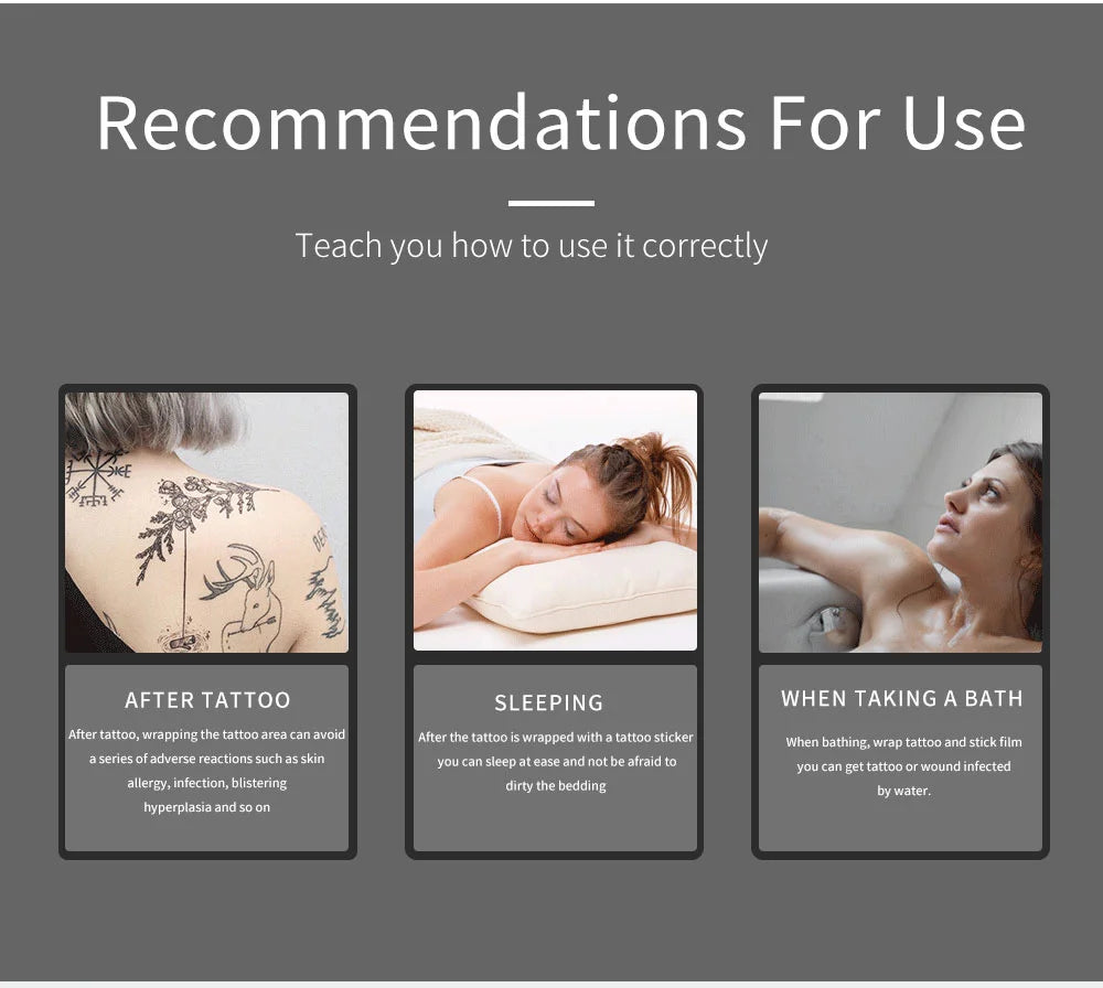 3.This attoo film aftercare is transparent,waterproof, breathable.It makes the skin breathe naturally,and excrete water,air and sweat,Reduced risk of infection after tattooing.